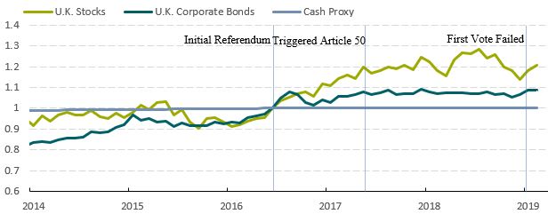 Given the recent string of events, I wanted to take this opportunity to comment on Brexit. Beyond the daily (or hourly) swings in prices, we can see UK company shares are up around 20.6% since the initial vote (in aggregate including dividends), UK corporate bonds are up 8.5% and cash has gone sideways. This can be seen in the chart above