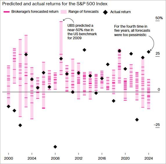 This chart from Bloomberg shows in pink the range of professional (!) forecasters – UBS, Morgan Stanley, Citi, Wells Fargo, Barclays, etc – for where the US market will finish the year. And the black diamonds show where the market ended up. You can see these forecasts have been overly pessimistic in 4 of the last 5 years.